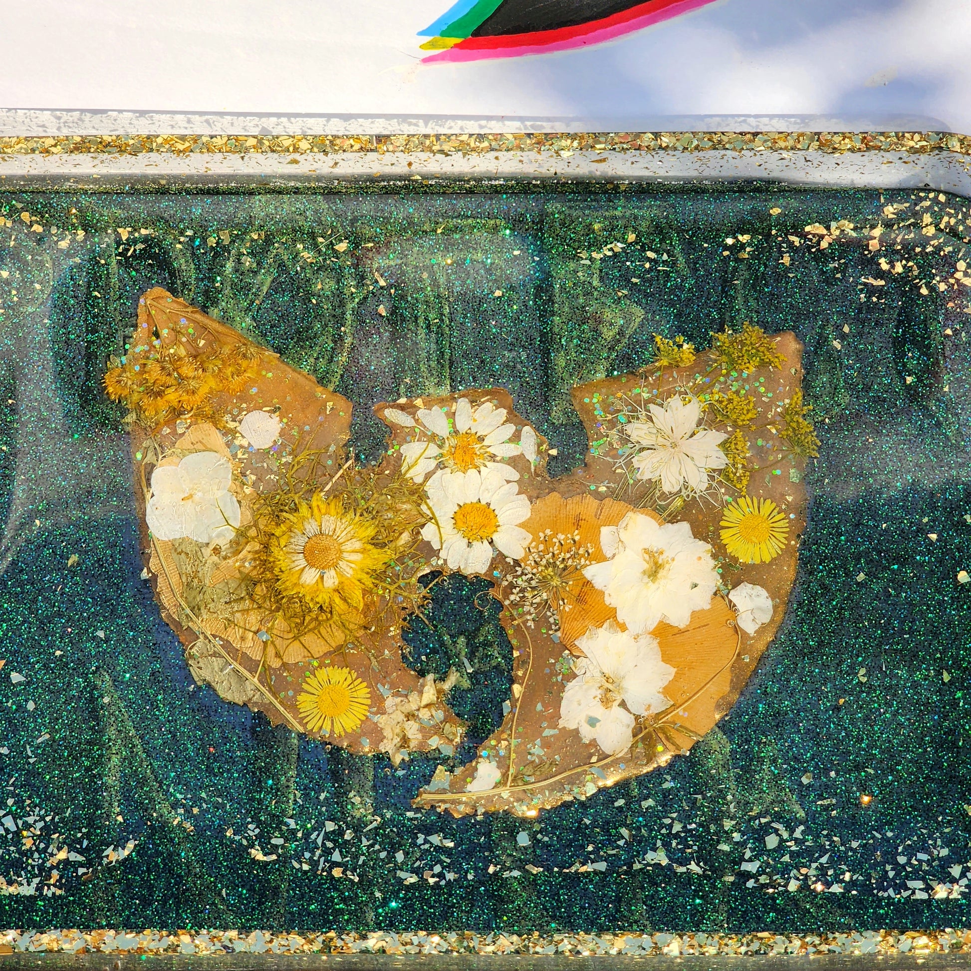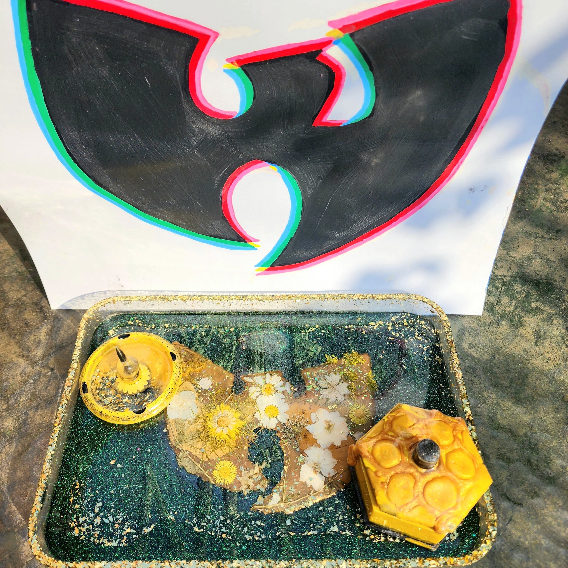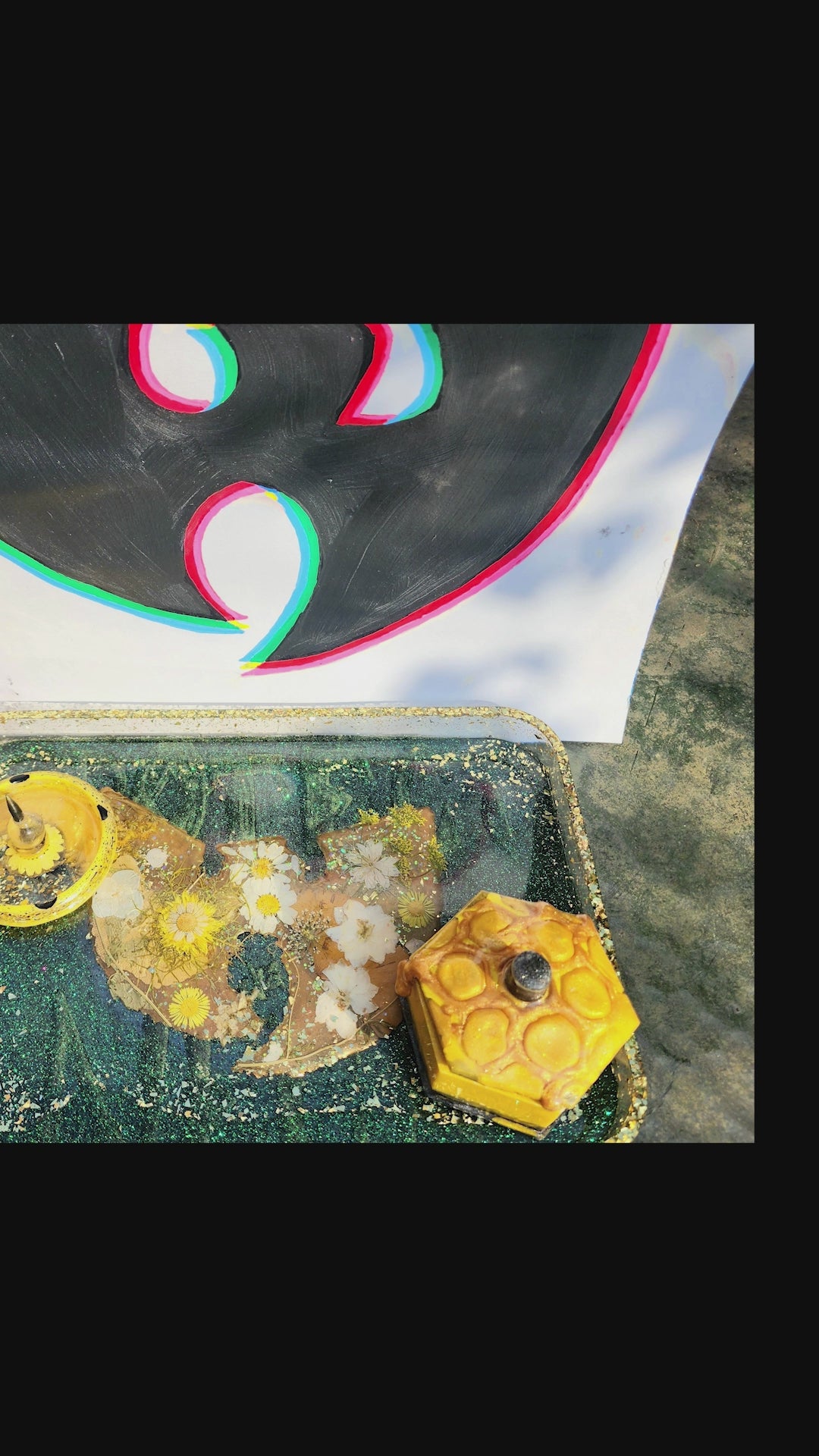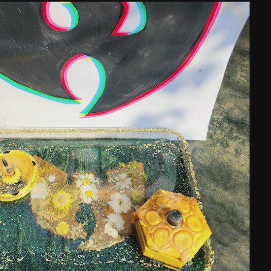 This awesome tray set was inspired by a little bee. All items of this set have been completed using freehand drawing techniques, acrylic paint, UV and Epoxy Resin, and hand drilled to give you something that doesn't come out of a mold. Truly one of a kind!!!